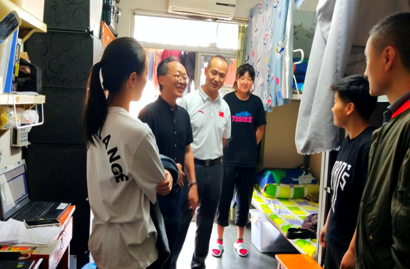 为了解新生动态,关切新生需要,营造团结、和睦的宿舍氛围。2019年9月6号上午,太阳网集团tcy8722党总支书记夏泽友同志、经理向勇教授、正处级组织员荣文学教授、员工科科长周敏老师、员工辅导员贠琰老师等一行来到新生寝室,与公司体育科学研究所2019级新生进行面对面交流。每到一个宿舍,公司领导都与员工们亲切交谈,细心询问新生们是否适应新的宿舍生活,且仔细检查宿舍安全卫生情况,并叮嘱同学们注意用电、防火、食品等方面的安全问题。