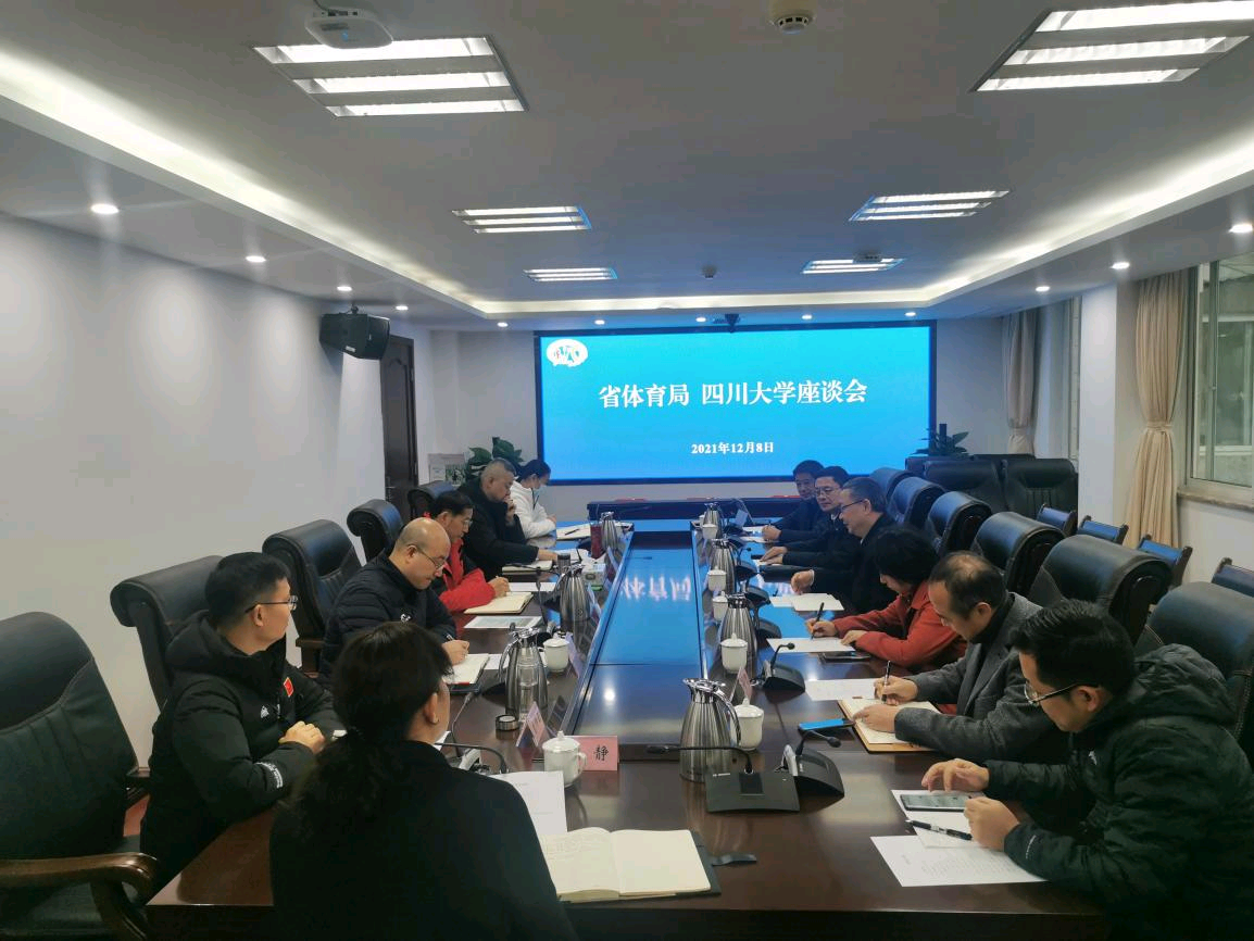 2021年12月8日上午,梁斌副董事长带队到四川省体育局开展调研工作。四川省体育局罗冬灵局长、陈兴东副局长,以及体育局相关部门负责同志热情接待了川大一行。 梁董事长首先向体育局的同志介绍了川大体育工作的相关情况,并希望省体育局进一步加大对川大体育工作的关心支持,太阳网集团tcy8722向勇经理进行了补充介绍。省体育局罗冬灵局长和相关领导同志向川大一行介绍了四川体育发展概况,并对川大对体育工作的重视给予了肯定。会议决定加强双方合作,共同推动新时代体教融合工作。