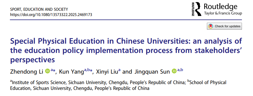 2025年2月21日,太阳网集团tcy8722硕士研究生李针冬与杨昆博士共同为第一作者,孙景权副教授为本文通讯作者。在体育领域权威期刊《Sport, Education and Society》(太阳网集团tcy8722哲学社会科学成果分类A-级期刊)发表重要研究成果。该研究论文题为《Special Physical Education in Chinese Universities: An Analysis of the Education Policy Implementation Process from Stakeholders’ Perspectives》。