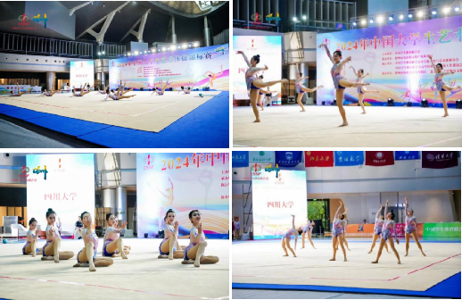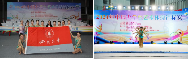 本次参赛的代表队成员分别来自艺术公司、生物医学工程公司、华西口腔医公司、华西药公司、华西临床医公司、经济公司、数学公司和商公司,均在大学期间才接触艺术体操。川大艺术体操队每周进行两次常规训练以及赛前平均每周10个小时集训加练,在教练谭月华老师、龙小雨老师的悉心指导下,队员们的身体姿态、器械能力和柔韧度等方面都取得了巨大进步。在此次全国锦标赛中,代表队成员赛出了风格与水平,克服紧张的心理情绪与身体的新伤旧疾,不仅出色地完成了六米抛接、鹿跳结环、大跨跳加后屈半劈腿跳等难度动作,还优美地呈现了波浪、旋转、摆动等艺术动作,集柔美感与力量感于一身。特别是一套以龙为主题的自选集体操,运用优雅的艺术体操动作演绎龙腾四海的威武之姿,通过精心编排的队形变化和翩若惊鸿宛若游龙的舞姿,营造出龙的灵动与威严,以高分15.999的绝对优势斩获冠军,在国家级体育赛场上尽数展现川大学子的精神风貌。