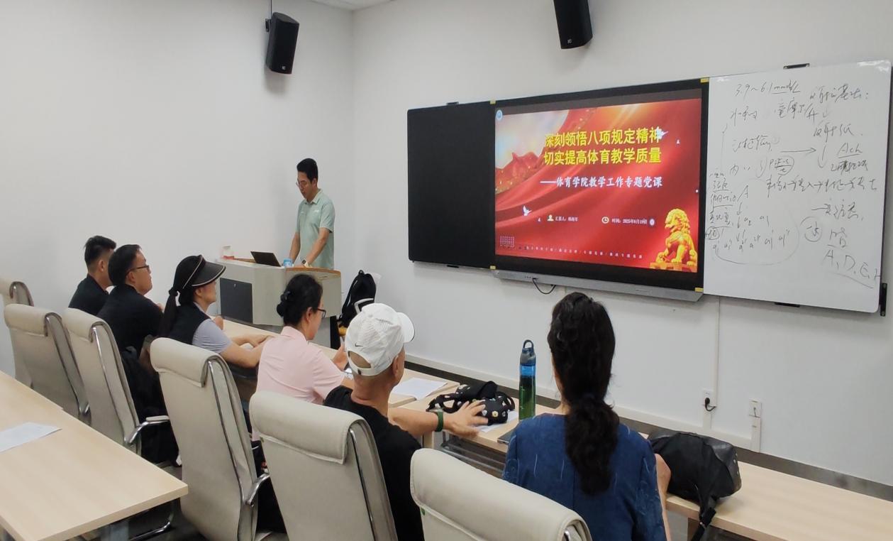 2025年6月19日,公司党总支副书记兼副经理韩海军同志以“深刻领悟中央八项规定精神 切实提高体育教学质量”为题,在江安未来游泳馆多媒体教室,为公司教师讲授专题党课。院教研室主任、运动训练系副主任兼班主任、教学督导组成员,教学科科长及干事,返聘离退休教师代表等20余名同志参加学习。